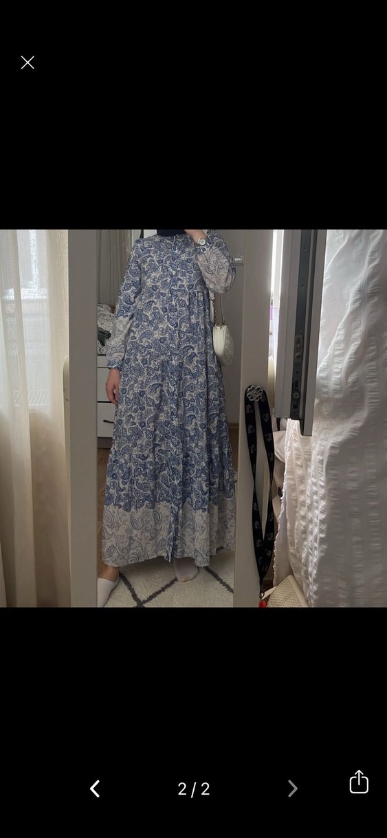 Bohem tarzı, bol kesim, uzun kollu, yüksek yakalı, mavi bağlama desenli, dökümlü uzun elbise. Günlük kullanıma uygun, sentetik kumaştan.