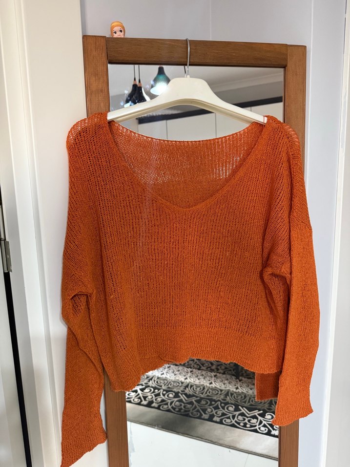 parlak renkte, bol kesim, uzun kollu, V yakalı örgü kazak