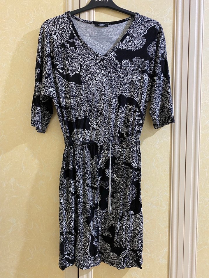 Uzun, bol kesim, kısa kollu, V yakalı ve kemerli desenli gri bohem tarzı elbisedir.