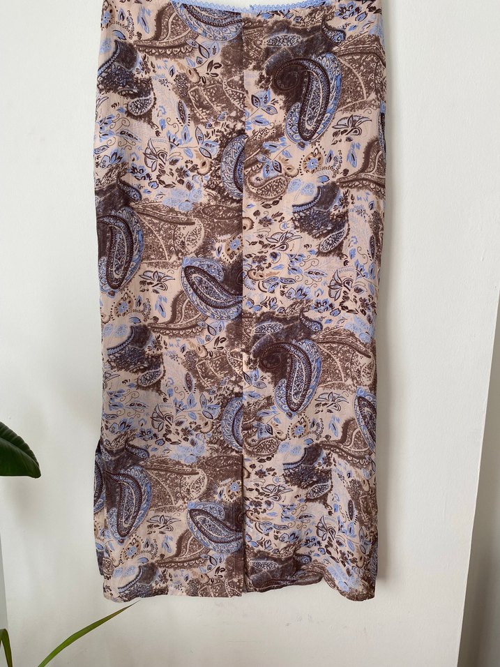 Bu uzun etek, bol kesim ve drapeli tasarımıyla pastel kahverengi batik desene sahiptir. İpek gibi kumaştan yapılmış olup bohem tarzını yansıtır.