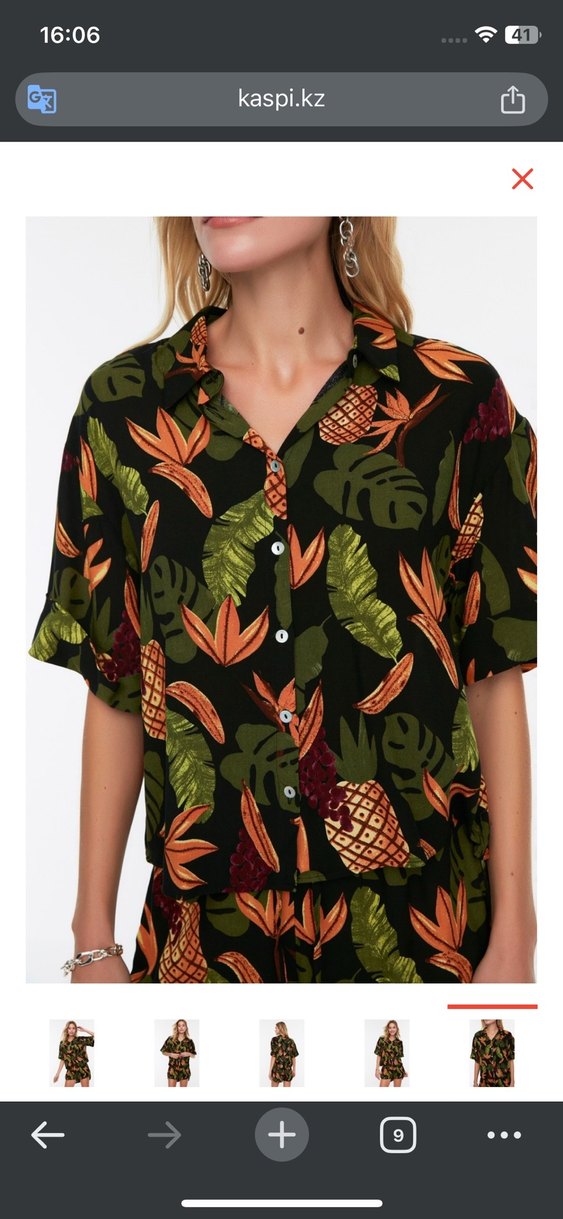 V yaka, kısa kollu, düğmeli, bol kesim yeşil tropikal desenli mini gömlek ve şort takım. yumuşak sentetik kumaştan.