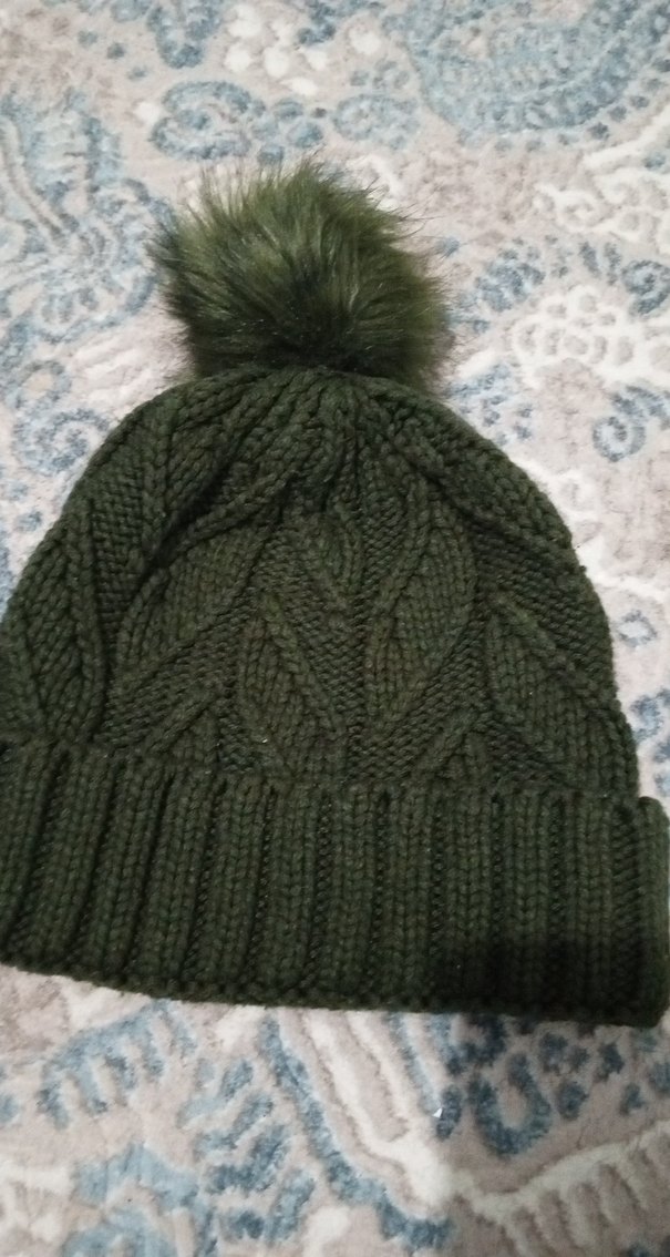 Yumuşak örgü kumaştan yapılmış, ponponlu yeşil bere. Bohem tarzıyla rahat bir görünüm sunar.
