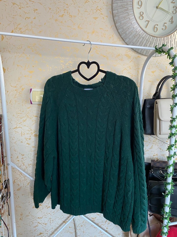 Bu koyu yeşil örgü kazak, uzun kollu ve yuvarlak yakalı, bol kesimiyle rahat ve bohem tarz sunar.