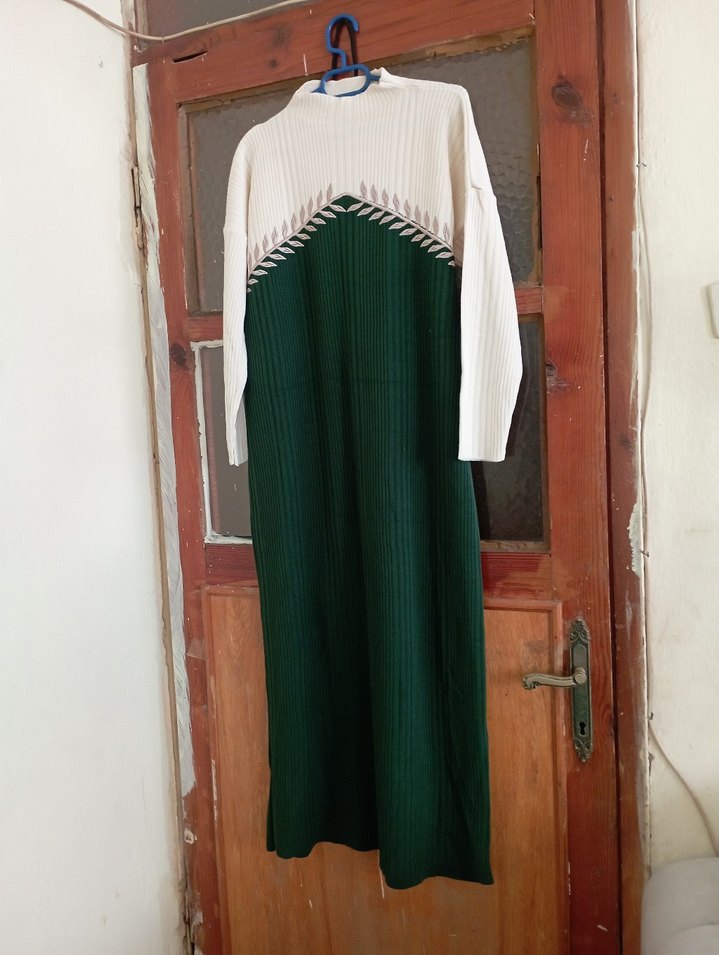 Kadınlar için bohem tarzda, triko kumaştan, pilili uzun elbise. Yarım boğazlı ve uzun kolludur, koyu yeşil ve beyaz renkler içerir. kullanılmamış