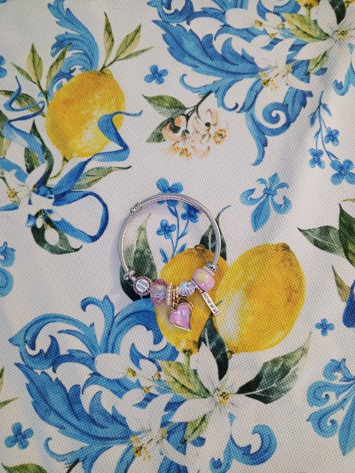 Bohem tarzda, zincir detaylı, pastel renkli boncuklar ve pembe kalp figürlü çocuk bilekliği. Retro ve hippie tarzı için uygun.