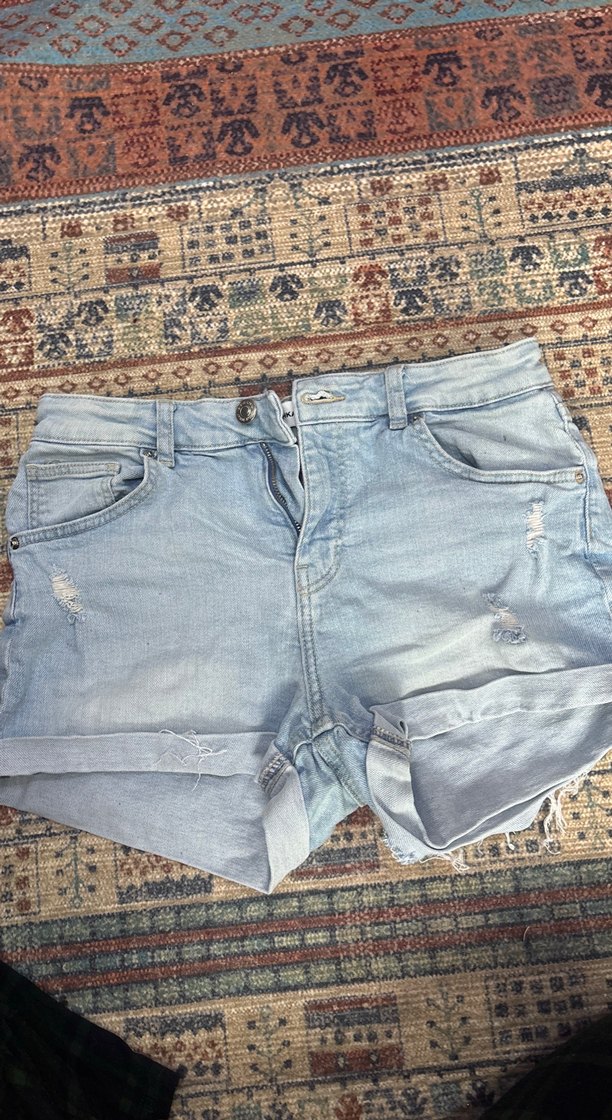 Bohem tarzda, bağcıklı ve yırtık detaylı pastel mavi tonlarında mini denim şort. Gevşek kesimiyle dış mekan sokak giyimine uygun.