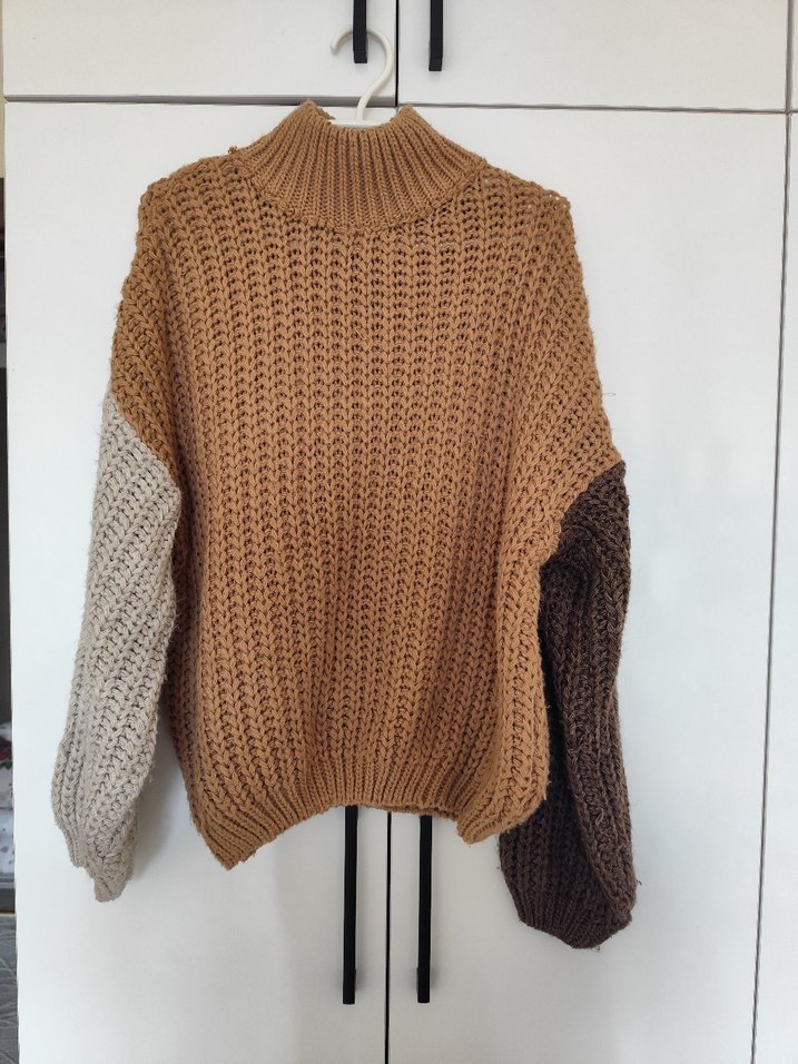 Bohem tarzda, boğazlı ve uzun kollu, kahverengi ve gri tonlarında örgü kadın kazak. Rahat kesimiyle günlük kullanıma uygundur.