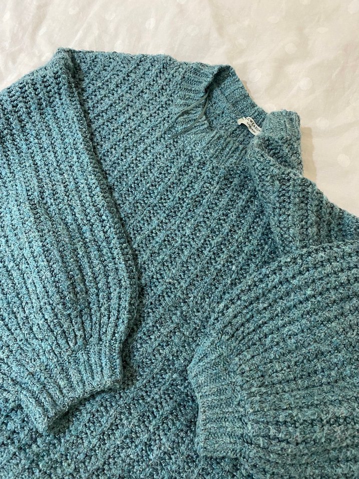 Turkuaz renkli, boğazlı ve uzun kollu, bol kesim triko kazak, rahat ve bohem tarzda günlük kullanım için uygundur.