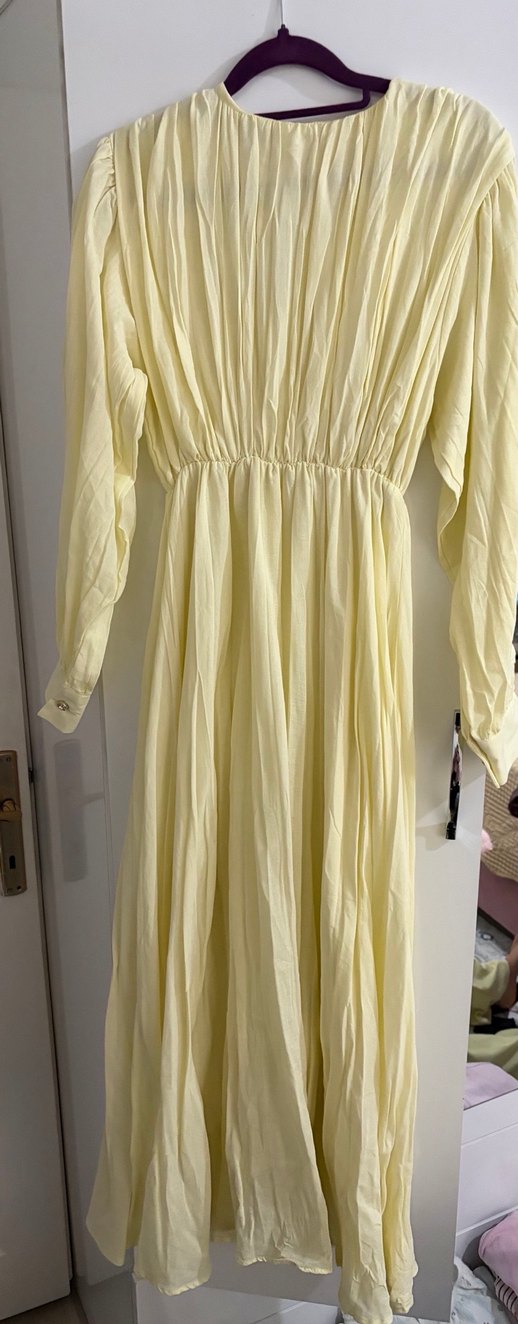 Uzun, bol kesim elbise, pile detaylı ve yüksek yakalıdır. Yumuşak keten kumaştan yapılmış, uzun kollu ve pastel sarı renktedir. Vintage bohem tarzını yansıtır.