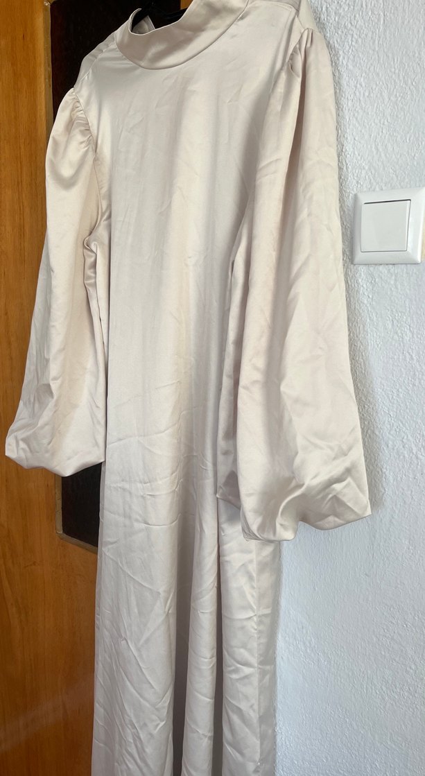Balon kol taş rengi elbise kemer ile kombini mükemmel duruyor