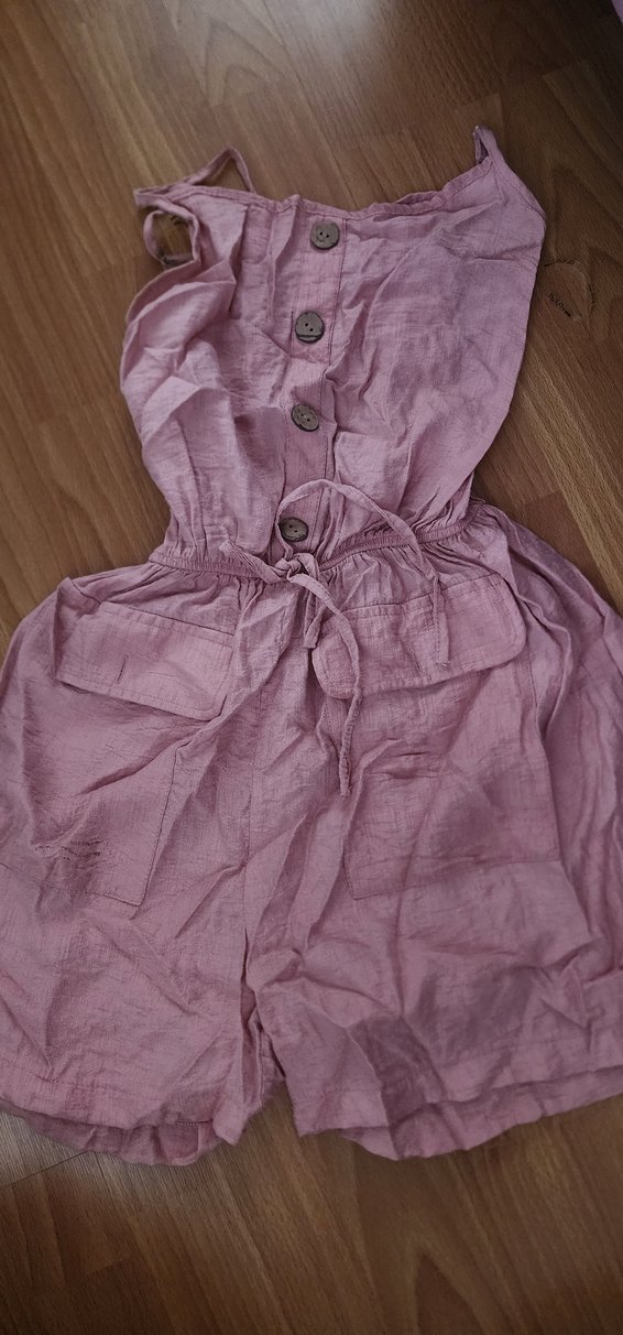 Pastel pembe renkte, keten kumaştan yapılmış, düğmeli ve cepli, bol kesim kız tulumu. Bohem tarzda ve kolsuz.