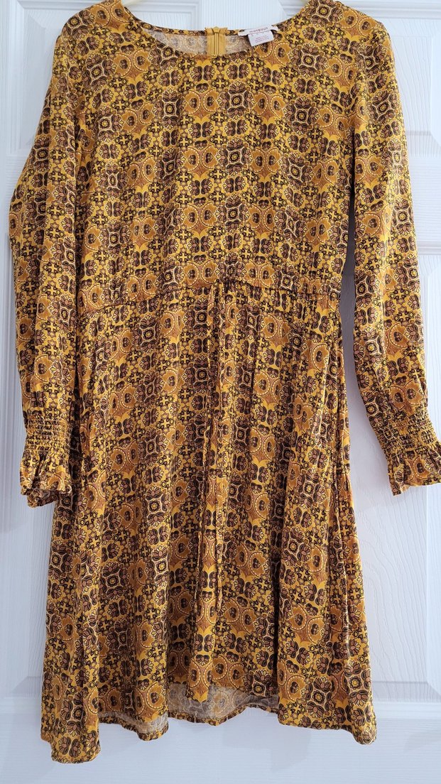 Sarı renkli, uzun kollu, yüksek yakalı ve pile detaylı bohem desenli hamile tunik, bol kesimlidir.