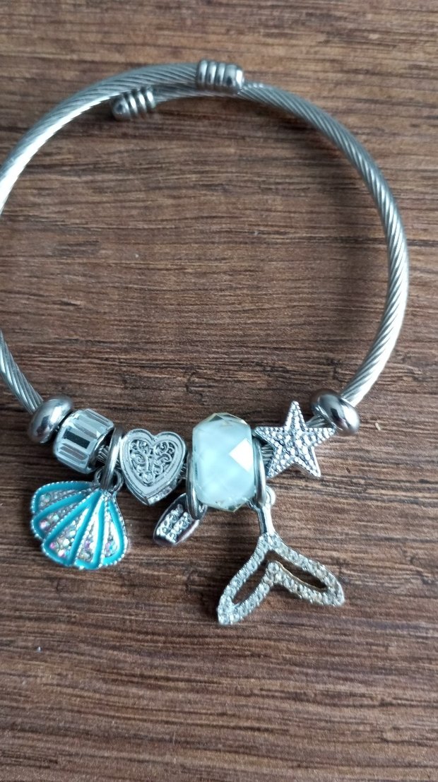 Bohem tarzında, turkuaz boncuklar ve deniz kabuğu, kalp, yıldız, denizkızı kuyruğu figürlü gümüş detaylı kadın bileklik. Günlük kullanıma uygun.