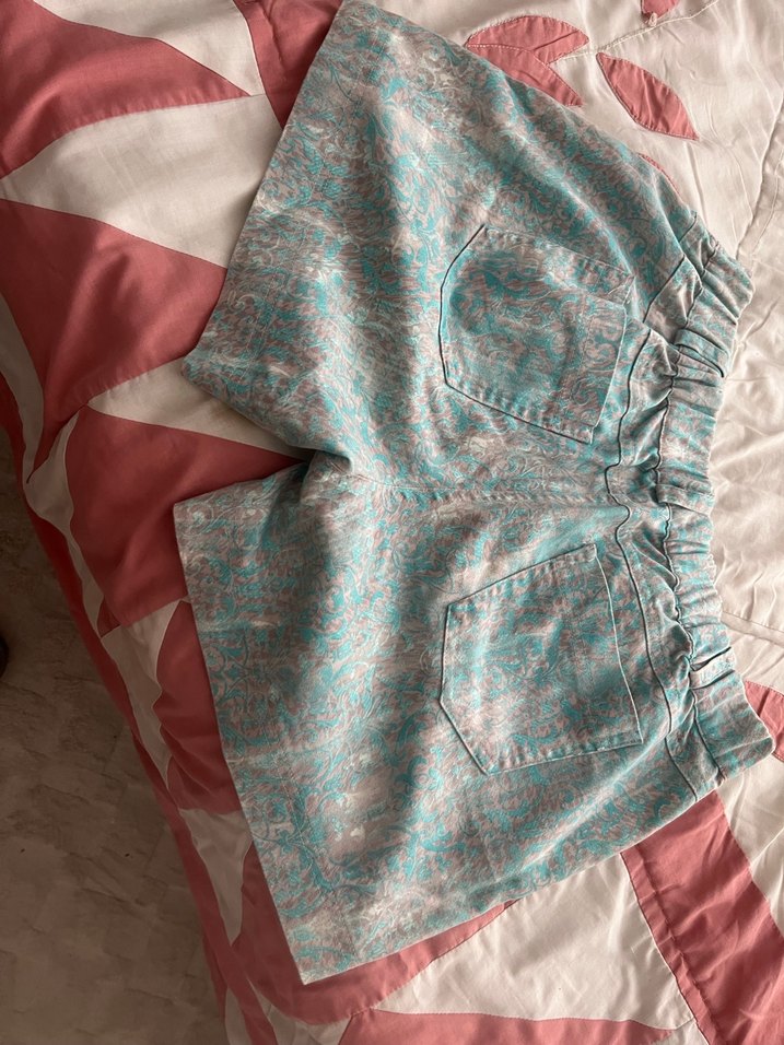 Bohem tarzda, bol kesim, pilili ve bağlamalı desenli turkuaz hamile şortu. Günlük kullanım için yumuşak tekstil kumaştan üretilmiştir.