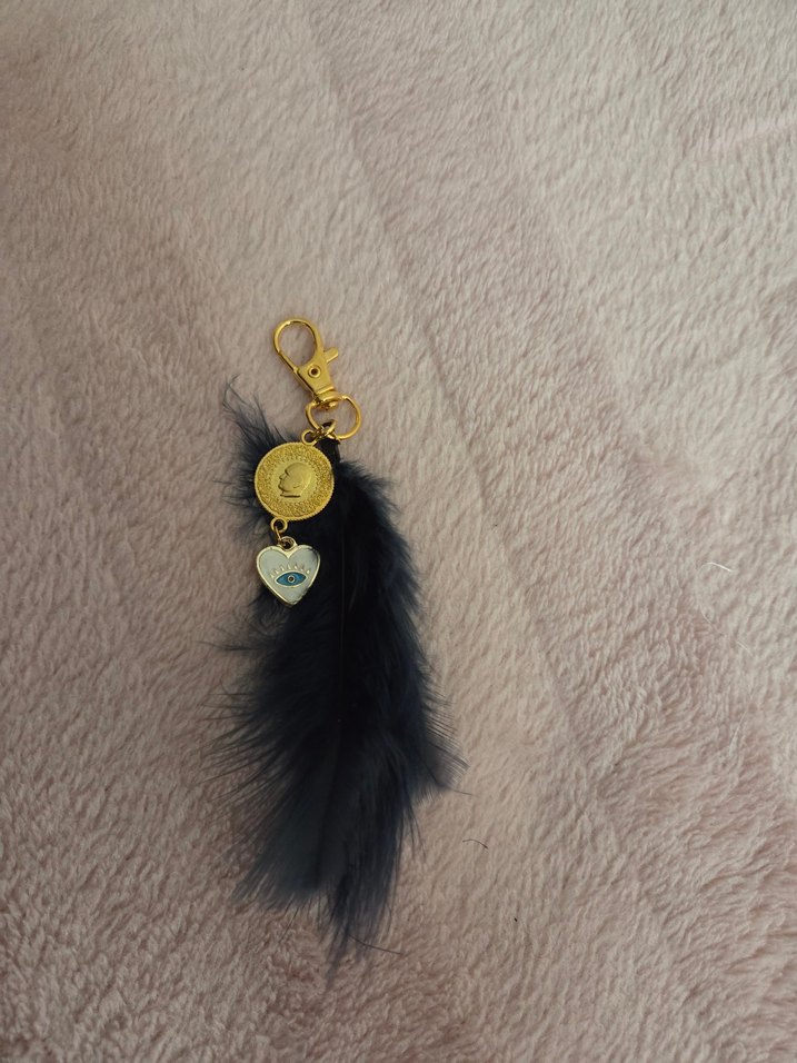 Altın renkli toka, koyu lacivert tüy püskül ve dekoratif aksesuarlar içeren bohem tarzda kadın anahtarlığı. Çanta süsü olarakta kullanılabilir. Para gelsin diye para ve nazar süsü ekledim.