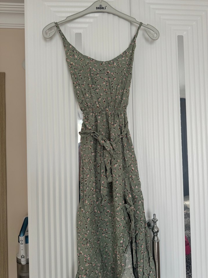 Midi, bol kesim askılı elbise, drapeli tasarımı ve yeşil tonlarda hafif batik desenle bohem tarzı yansıtıyor.