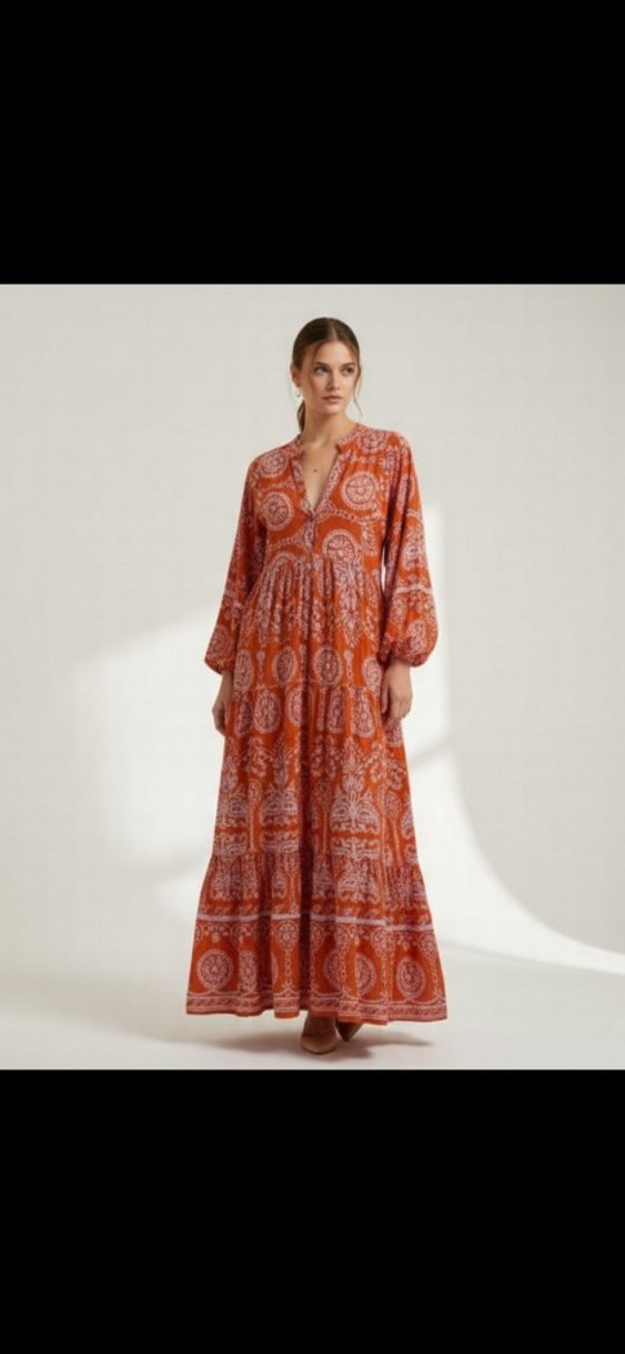 Bohem tarzı, bol kesim, V yakalı, uzun kollu ve püskül detaylı uzun elbise.Turuncu batik desenli yumuşak kumaştan, günlük kullanıma uygun. hiç giyilmedi balon kol 2 bdn