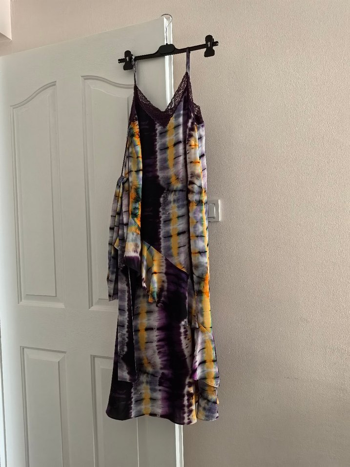 Bohem tarzda, koyu mor bağlama desenli, kolsuz ve askılı midi elbise. Rahat dökümlü ve yumuşak sentetik kumaştan üretilmiştir.