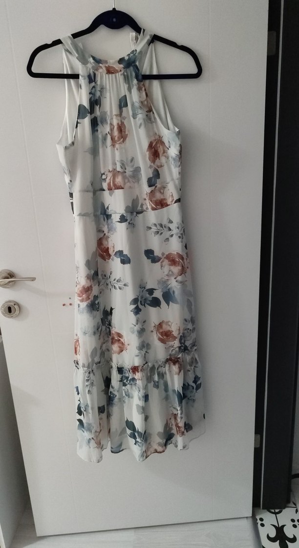Bohem tarzda, yüksek yakalı ve bol kesim uzun elbise. Yumuşak sentetik kumaştan, gri tonlarında tie-dye çiçek desenli, kolsuz ve günlük kullanıma uygun.