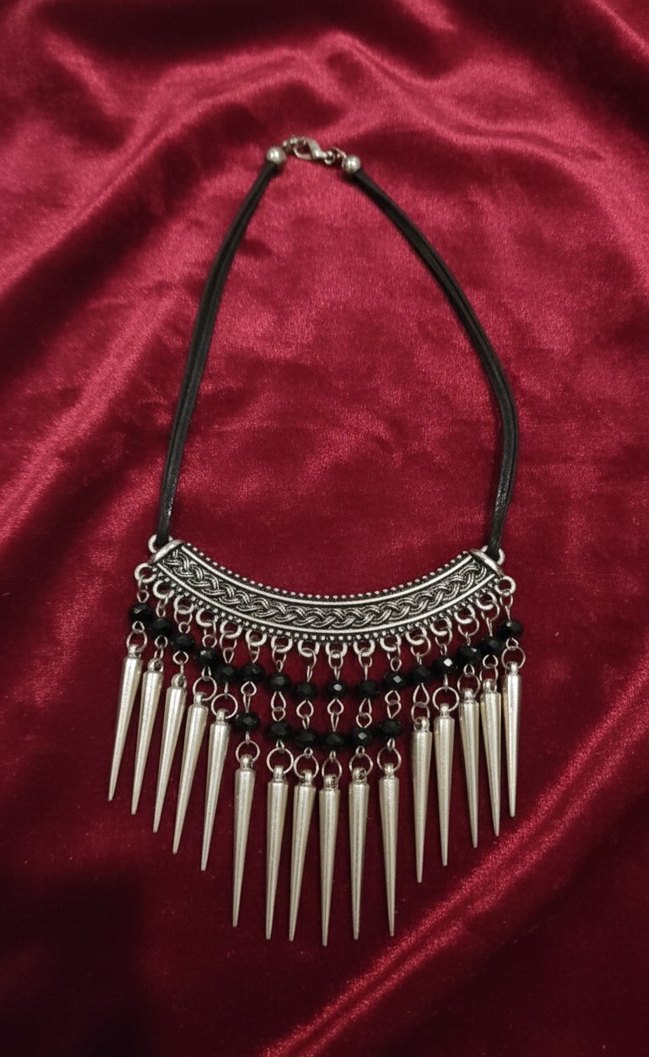 Boncuklu ve işlemeli detaylara sahip uzun kolye, giyimde gotik ve bohem tarzı yansıtır.