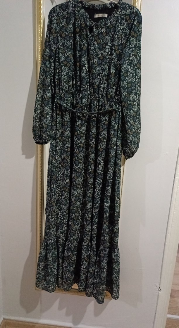 Bohem tarzı, bol kesim uzun elbise yüksek yaka ve askılı kol detaylarına sahip. Yumuşak sentetik kumaştan, koyu renkli batik desenli, kemerli, günlük kullanıma uygun.