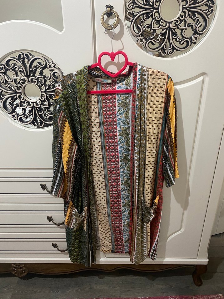 Bu kadın kimono, bol kesim, dökümlü tasarım ve askılı kollarla dikkat çeker. Uzun boylu, çok renkli desenli kumaştan yapılmıştır ve halter yakaya sahiptir.