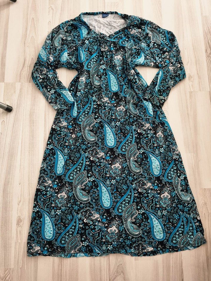 Uzun kollu, mavi renkli, desenli bohem elbise. Salaş kesim ve drapeli detaylara sahip, yumuşak sentetik kumaştan üretilmiştir. Günlük kullanıma uygundur.