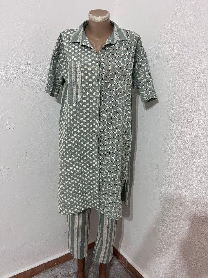 düğmeli, kısa kollu, notched lapel yakalı, bohem tarzda uzun kadın tunik. Yumuşak kumaştan, bağlama desenli, günlük kullanıma uygun.%100 pamuk