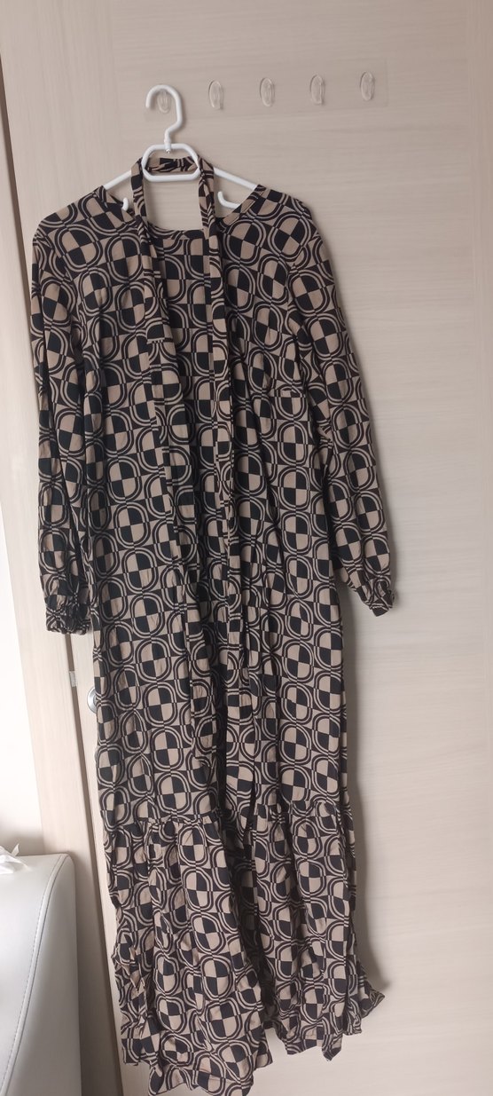 Yüksek yakalı, uzun kollu ve bol kesim bu elbise zincir detaylarıyla süslenmiştir. Kahverengi ve gri geometrik desenlerle bohem tarzı yansıtır. beli kemerlidir