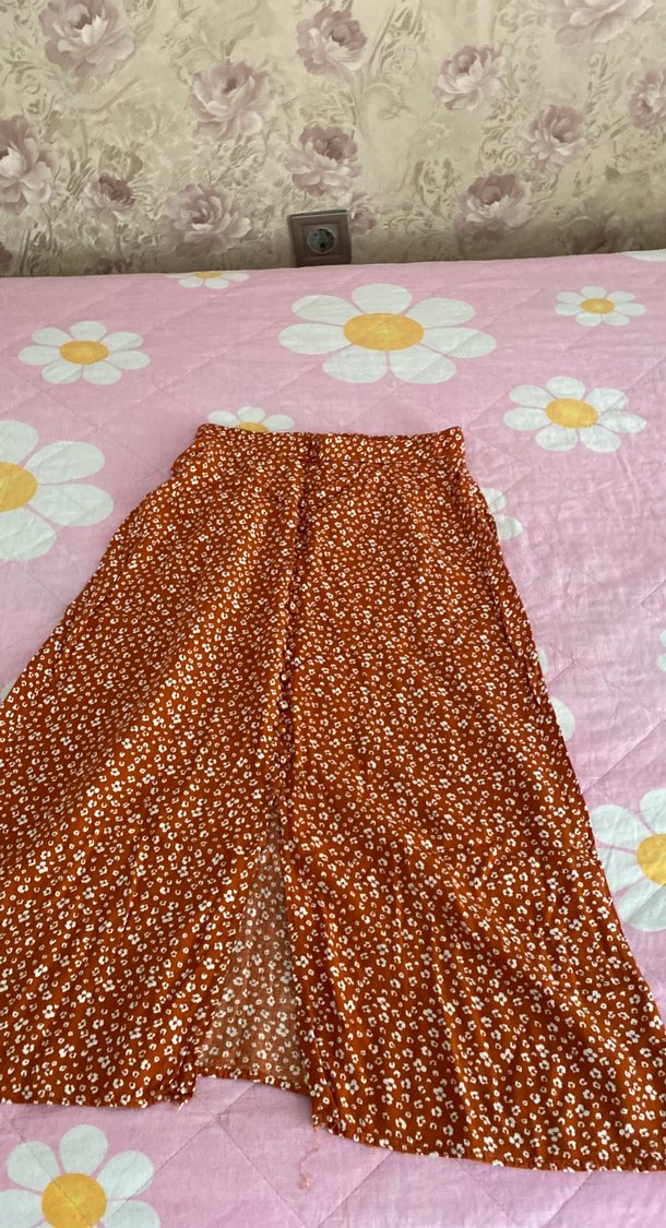 Hafif sentetik kumaştan, bol kesim, kahverengi bağlama desenli, fırfırlı uzun bohem etek.