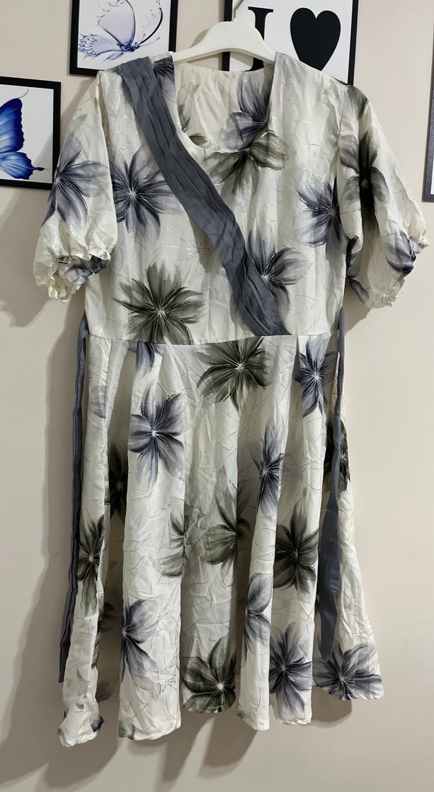 Kadınlar için bol kesim, kısa kollu ve uzun boyda bir elbise. Gri ve beyaz tonlarda bağlamalı çiçek desenli, bohem tarzda hafif kumaştan üretilmiştir.