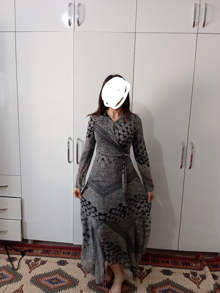 Bohem tarzda, yılan desenli gri, V yakalı, uzun kollu, dökümlü ve vücuda oturan uzun elbise. Günlük kullanıma uygun, yumuşak sentetik kumaştan yapılmıştır. yazlık elbise açıklar için dekoltesi açılıyor sadece bı kere giyildi çok serin ve rahat alt astarinda sadece 2-3 delik var oda hiç görünmüyor