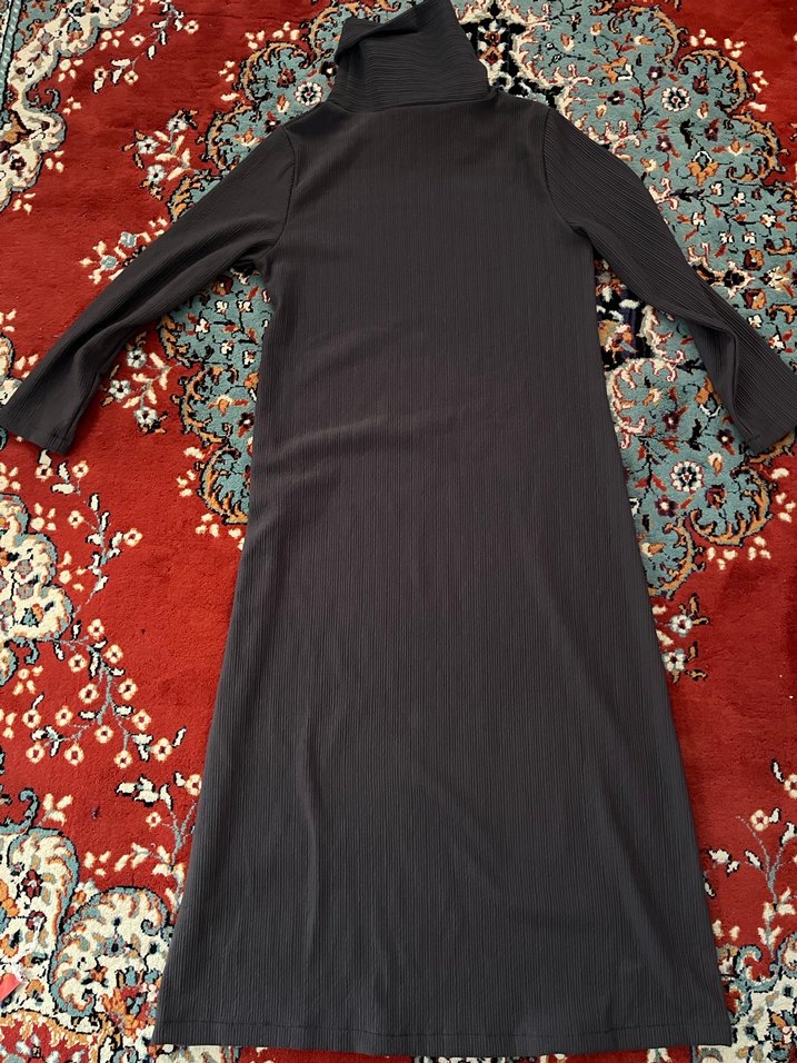 Dar kesim uzun elbise, uzun kollu ve yüksek yakalıdır. Yumuşak sentetik kumaştan, koyu gri renkte ve bohem tarzda drapeli tasarıma sahiptir.