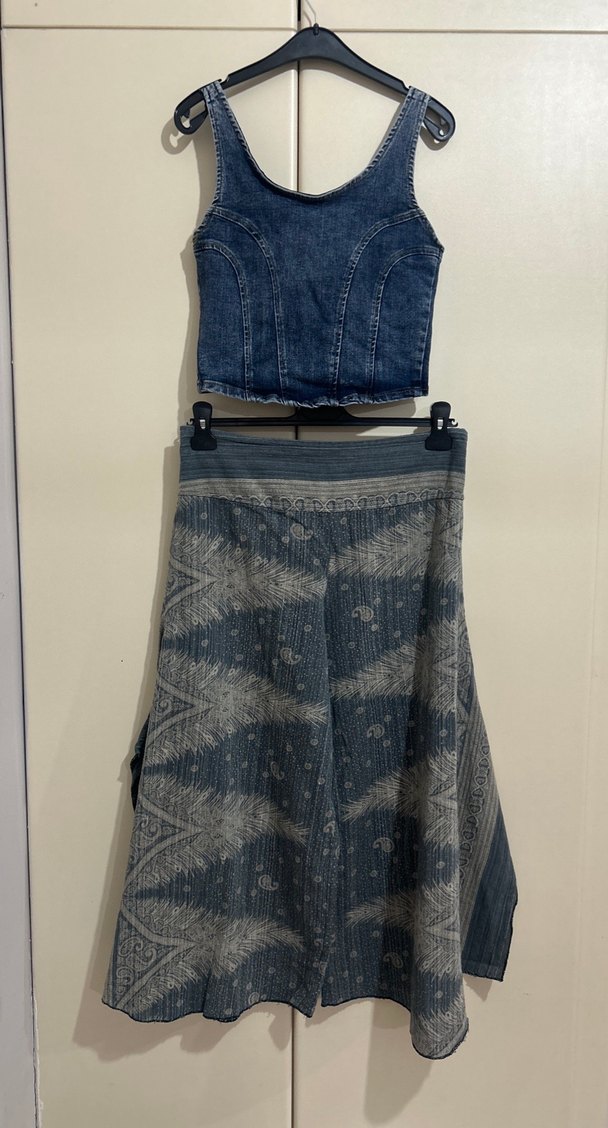 Bohem tarzda, bağlama desenli, lacivert ve gri tonlarda uzun, bol kesim ve drapeli kadın eteği. Denim kumaştan üretilmiştir.