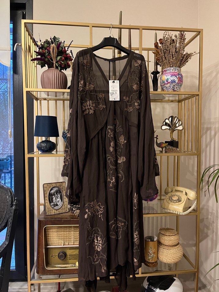 Bohem tarzda, uzun kol ve V yaka detaylı, bol kesim kahverengi nakışlı uzun elbise. İpek gibi kumaş ve drapeli tasarımla romantik akşamlar için uygundur.