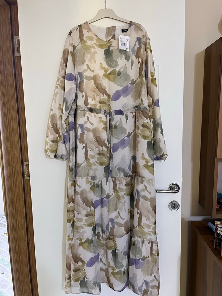 Bohem tarzda, bağcıklı, uzun kollu, salaş kesim, yuvarlak yakalı, açık haki tonlarında batik desenli sentetik kumaştan günlük kullanıma uygun kadın elbise.