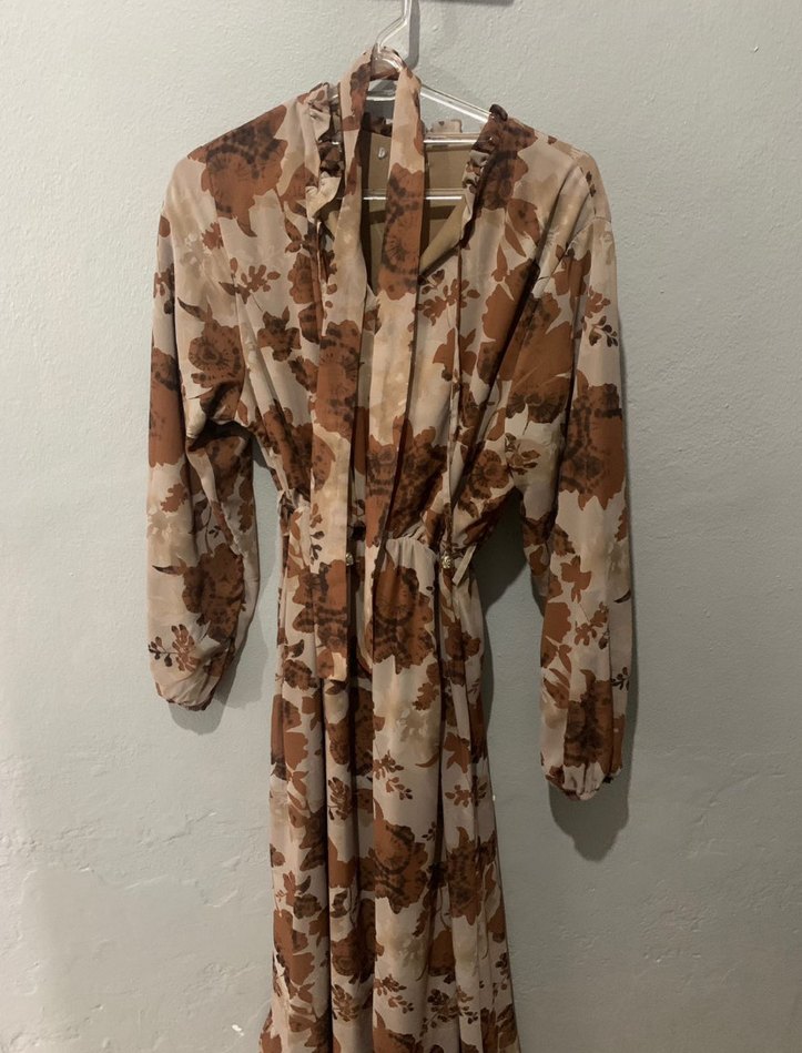 Yüksek yakalı, uzun kollu, bol kesim bej renkli, koyu tonlarda desenli, dökümlü tasarıma sahip sentetik kumaş elbise. Günlük kullanıma uygundur.