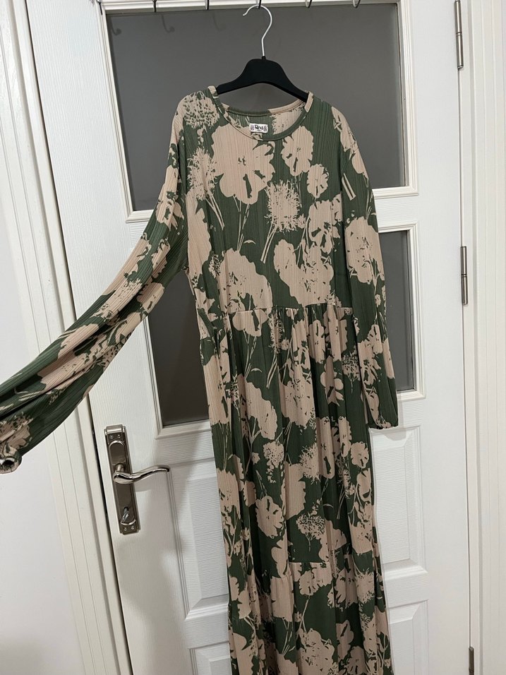 Bohem tarzda, uzun kollu ve salaş kesim olan bu elbise, drapeli detaylara sahiptir. Haki ve gri çiçek desenli, yumuşak sentetik kumaştan üretilmiştir.