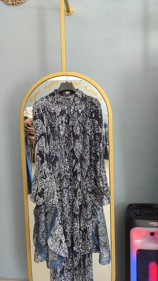 36-38-40-42-44 mevcuttur Bohem tarzda, uzun kollu ve yüksek yakalı, bağlamalı, bol kesim ve mavi-gri bağlama desenli drapeli elbise.