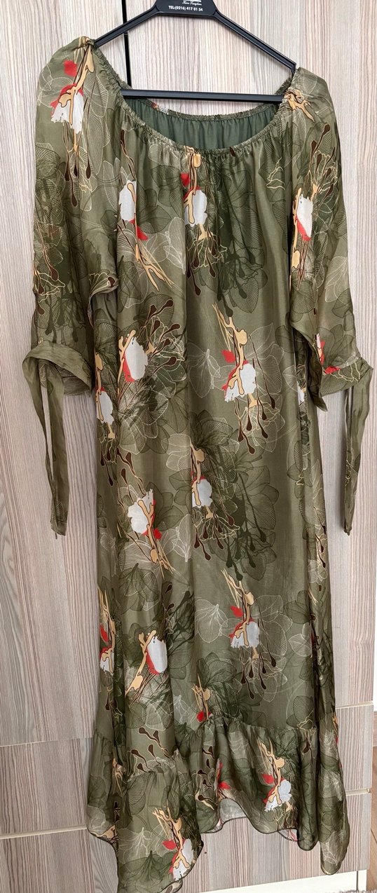 Bohem tarzda, salaş kesim, drapeli uzun kollu ve straplez yaka detaylı, haki kamuflaj desenli uzun kadın elbisesi.