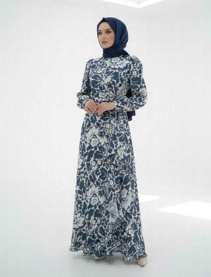 Lacivert uzun elbise,yüksek yaka ve uzun kollu. Bağlamalı desenli ve drapeli sentetik kumaştan, bohem ve modest tarz için uygun.