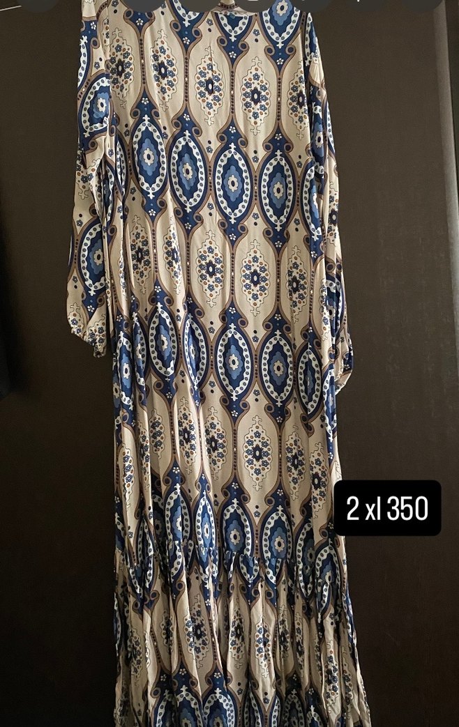 Mavi batik desenli, uzun kollu, bol kesim, drapeli, yumuşak dokulu uzun elbise. Geniş kayık yaka ile günlük kullanıma uygundur.