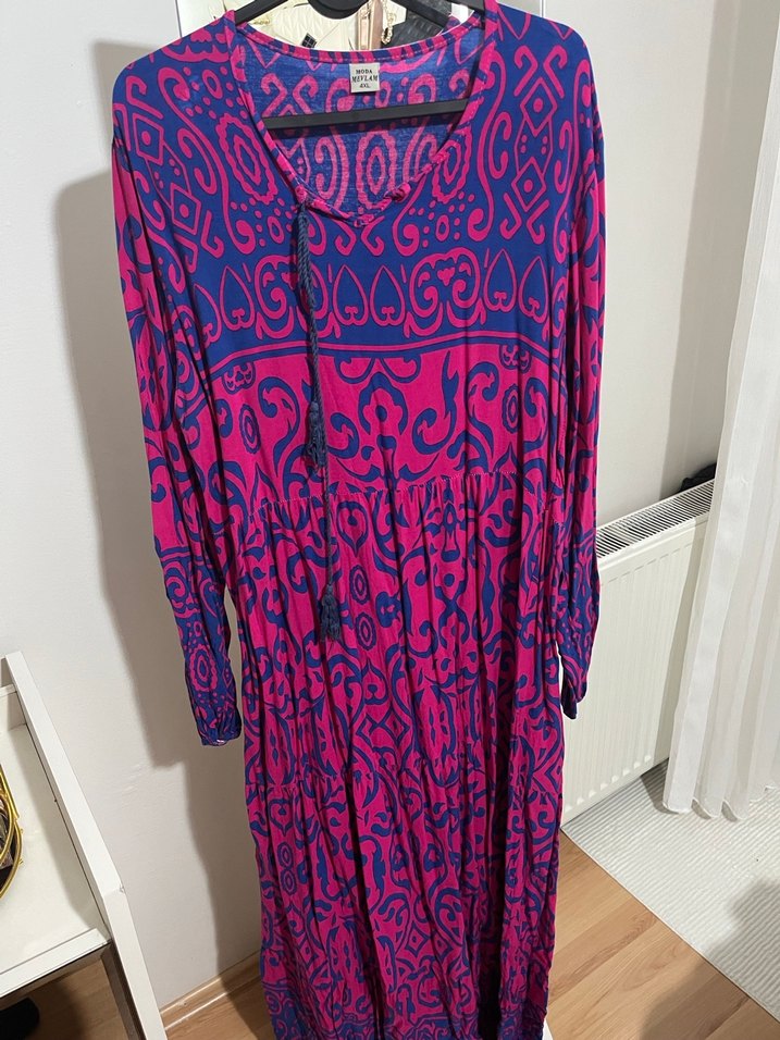 Renkli bohem uzun elbise, bol kesim, uzun kollu ve V yaka püsküllü detaylara sahiptir. Mor tekstil malzemesi sanatsal desenlidir, romantik akşamlar için uygundur.