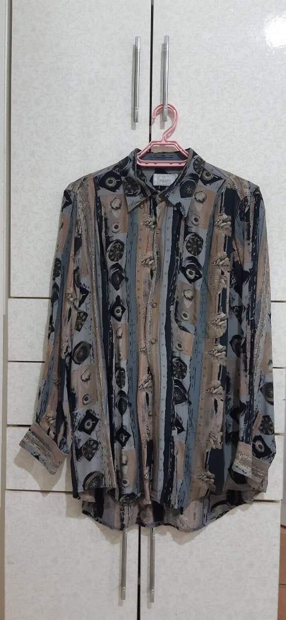 Bohem tarzda, uzun kollu, yakalı ve düğmeli önlü bol kesim gömlek. Kahverengi ve gri tonlarda vintage bağlama desenli, yumuşak tekstil kumaştan üretilmiştir. 1 veya 2 kez giyilmiştir. 40-46 bedene kadar olur.