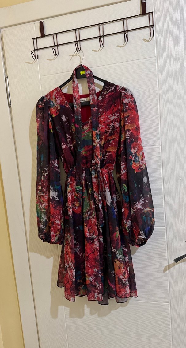 Bohem tarzda, uzun kollu ve bağlamalı, çok renkli koyu tie-dye desenli, bol kesim ve dökümlü elbise. Yumuşak sentetik kumaştan, romantik akşamlar için uygun.