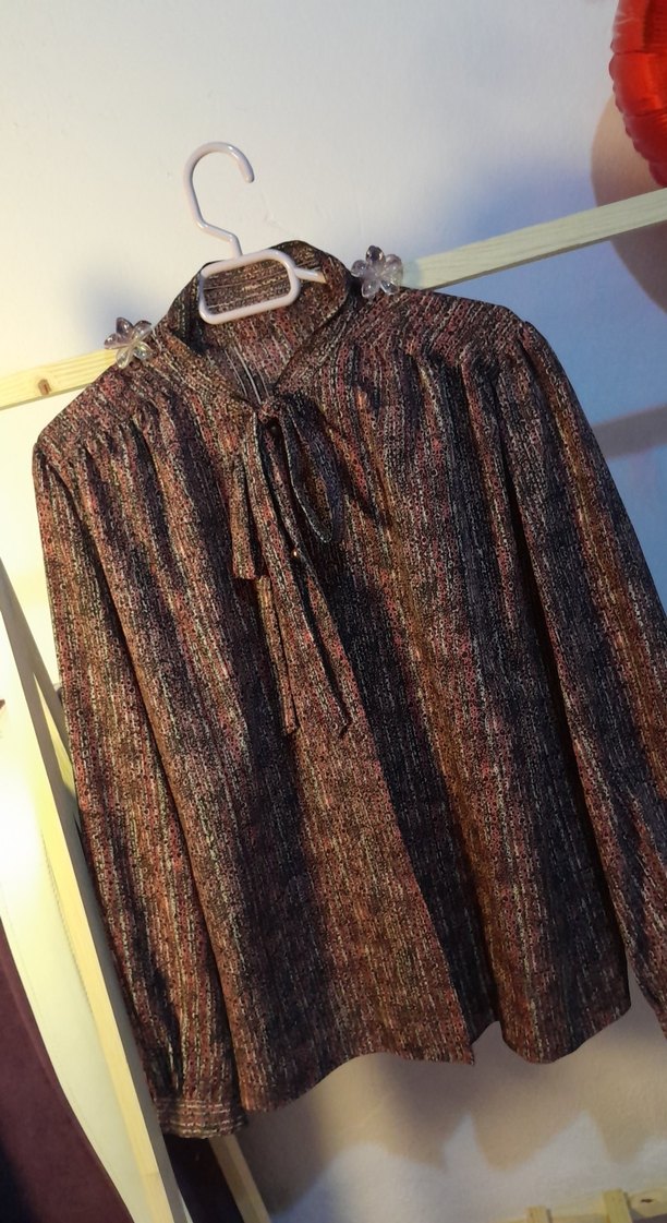 Kahverengi bohem gömlek, bağlamalı yüksek yaka, uzun kollu ve bol kesimdir. Koyu batik deseniyle vintage bir hava katar. Günlük kullanım için uygundur.