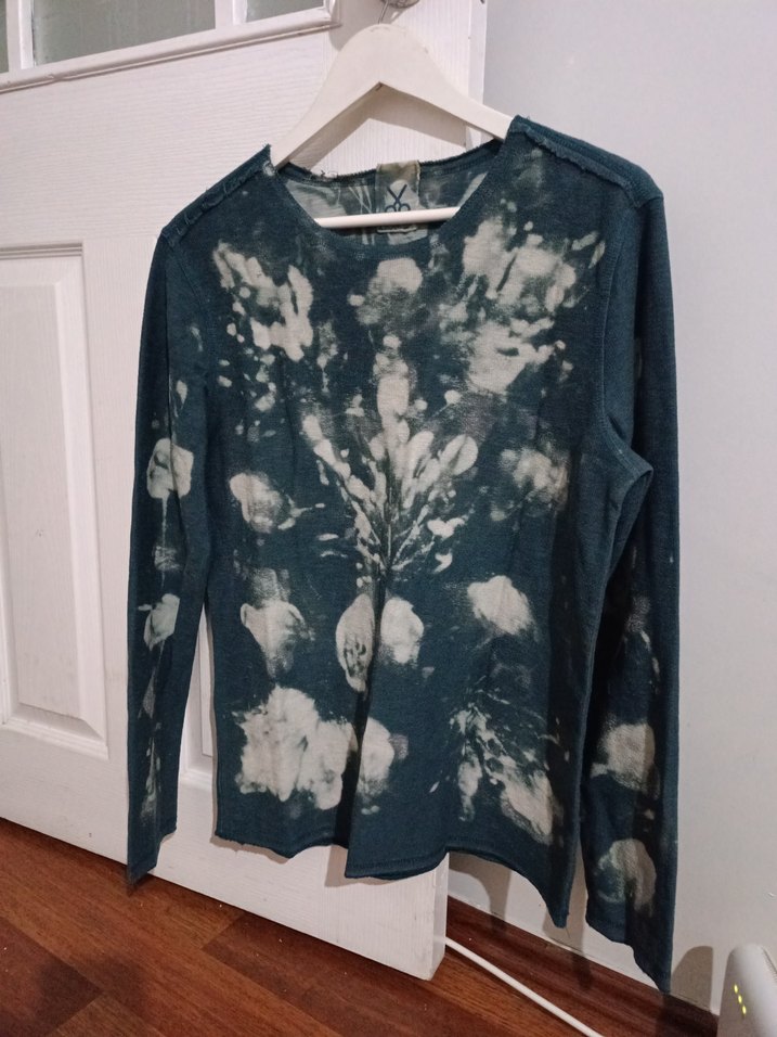 Bohem tarzda, uzun kollu, yuvarlak yaka, batik desenli koyu mavi renkli, gevşek kesim örme kadın kazak. Günlük kullanıma uygundur. en 50 boy 63