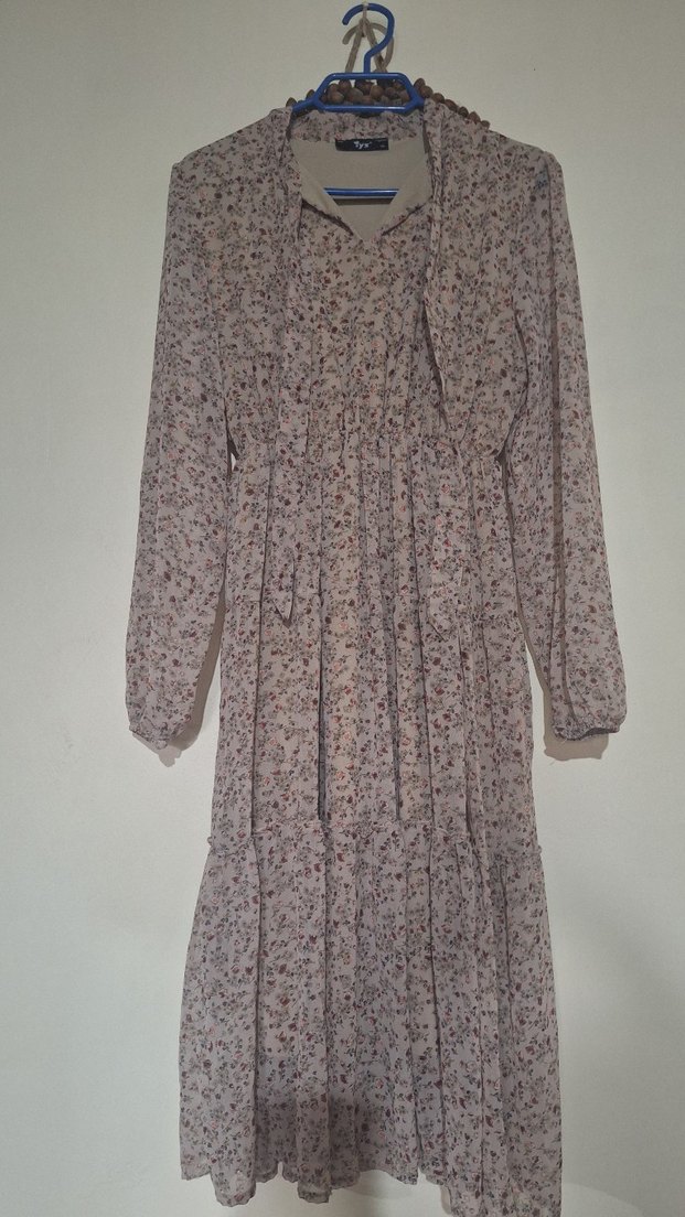 Bohem tarzda, uzun kollu ve yüksek yakalı bej elbise. Bol kesim, fırfır detaylı ve çiçek desenlidir. Rahat sentetik kumaştan yapılmıştır. çok çok az giyildi