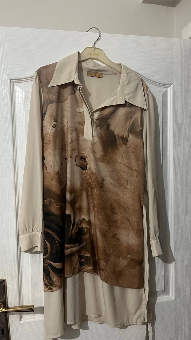 Bu uzun bej gömlek, bol kesim ve dökümlü tasarım ile bağlama desenine sahiptir. Yaka ve uzun kolludur, ipeksi kumaştan vintage bohem tarzı sunar.