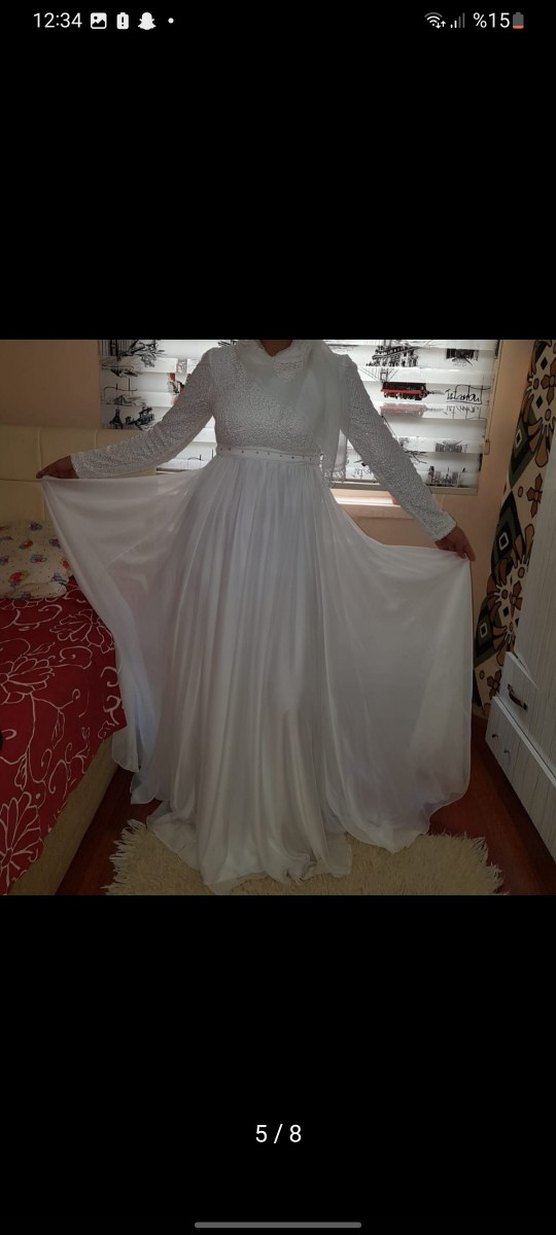 Yüksek yakalı ve uzun kollu, bol kesim beyaz A kesim gelinlik. Hafif kumaşıyla klasik zarafet ve bohem tarzı bir arada sunar. İmam nikahında kullandım temizdir ütü gerekli sadece 1.73 boy 65 kilo ile giydim m l uyumlu